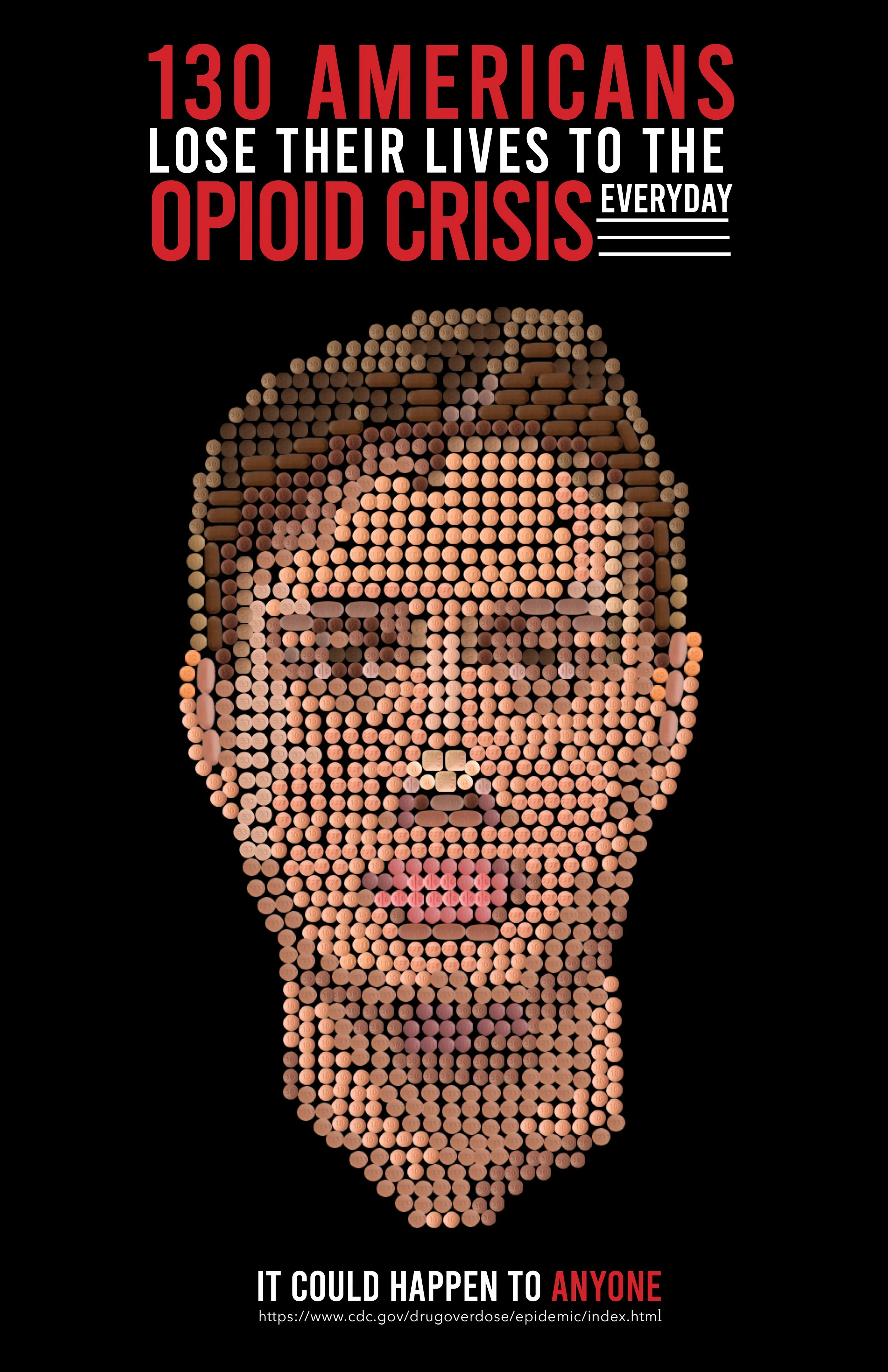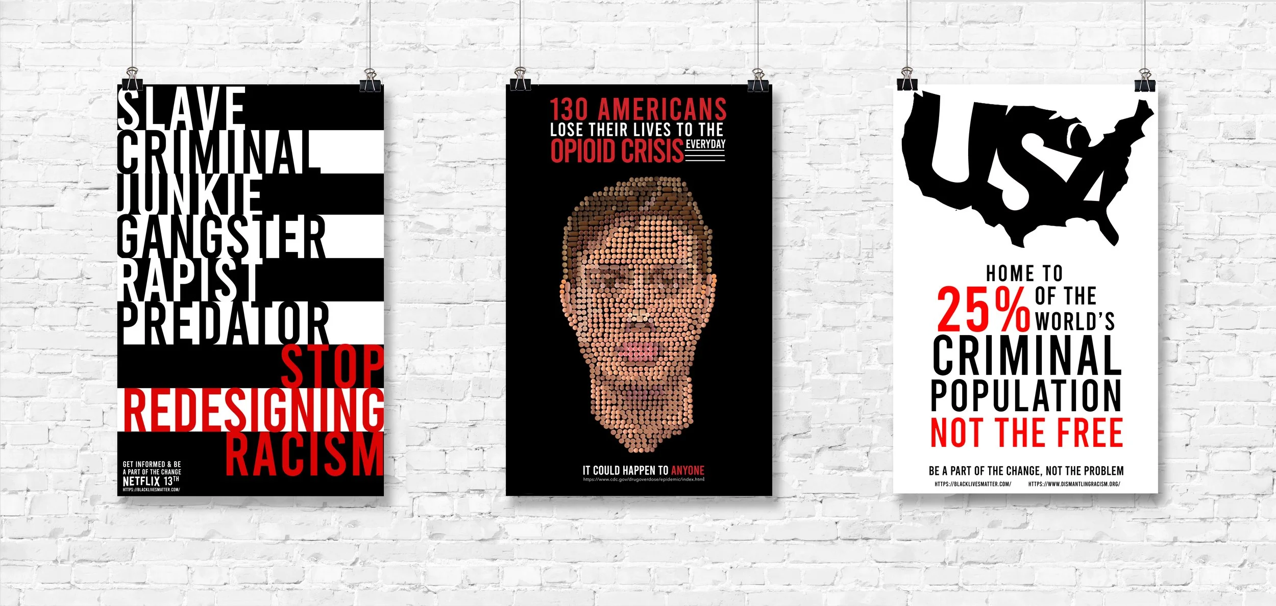 Each of these posters is meant to bring awareness to different prevalent social issues. The first and third posters serve as advertisements for the Nextflix Documentary 13th. The documentary explored racial inequality throughout the history of the United States and focused specifically on the disproportionate number of U.S. prisoners being African-Americans. The posters use only words and the colors red, black, and white to convey themes from the documentary. The second poster in the middle comments on the opioid epidemic that has been plaguing our country in recent years. The face created and shown on this poster is the focal point, and is made completely of pills.
